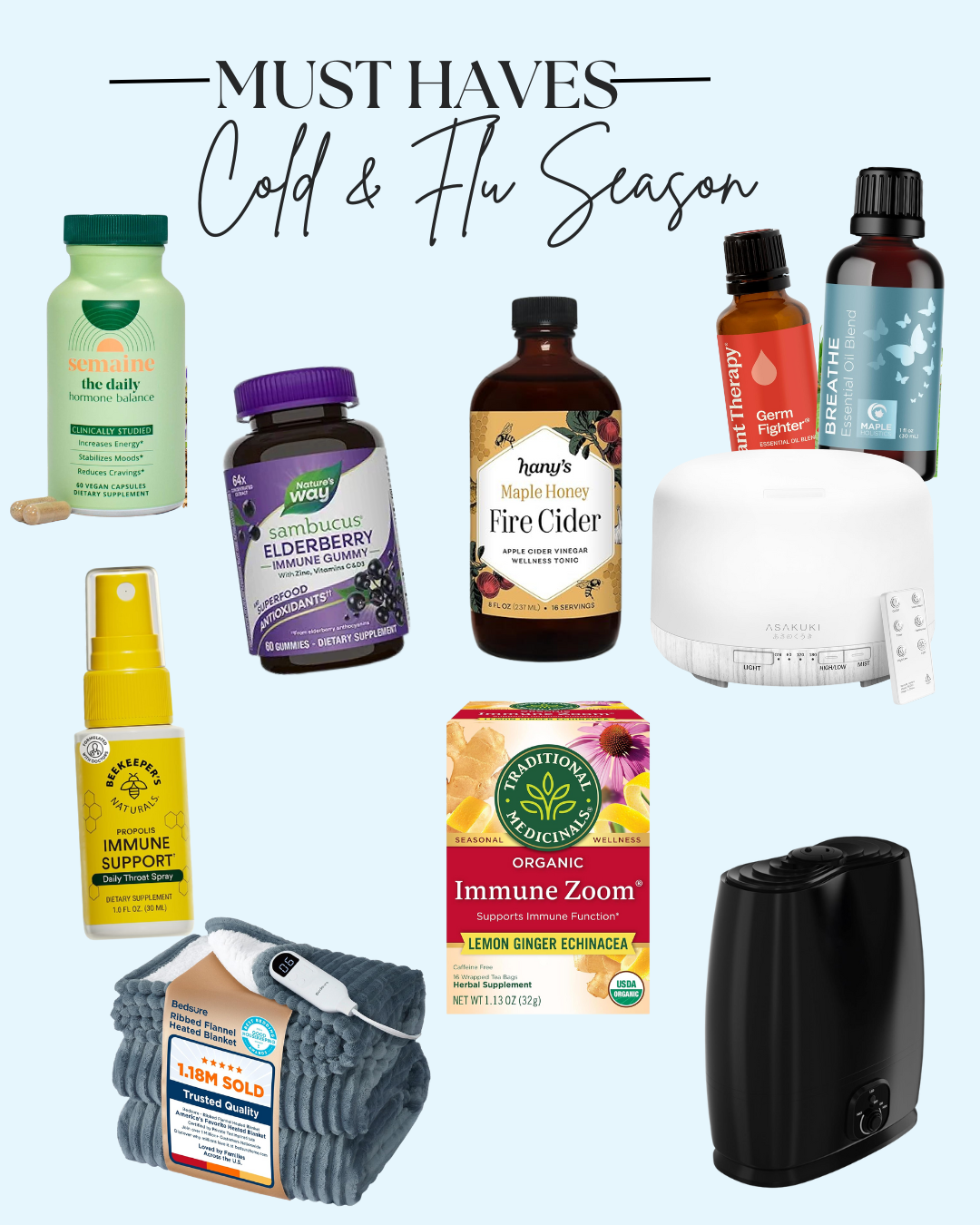 Those are all my must haves for the cold and flu season! Of course there’s all the obvious; get plenty of rest, hand-sanitizer, clean frequently, and get outside as much as possible.