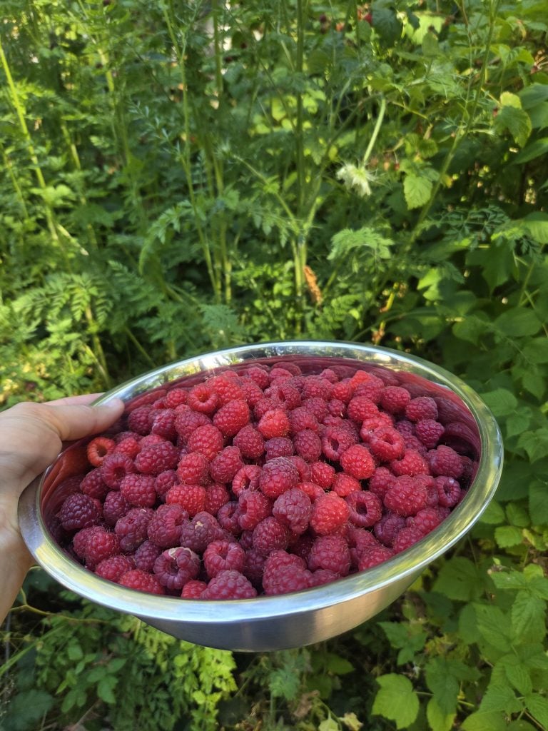 Our raspberries produced pounds of delicious berries for us this year, so much that I couldn’t even keep up towards the end. We ate a bunch fresh and froze most for later use.