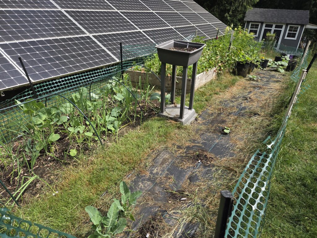 This year I will work on putting wood chips down for a path, and putting the fence up to keep out animals. I also want to purchase more hoops/cover to expand the growing season. I can’t grow anything too tall here, that would block the solar panels.