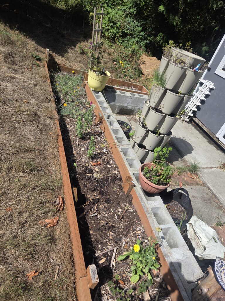 The solar panels are to the left of this area, and I wanted to prevent eroding here, so my dad put in this wall and raised bed last year. I was able to put in a few flowers here for the pollinators, and that’s my plan again this year.